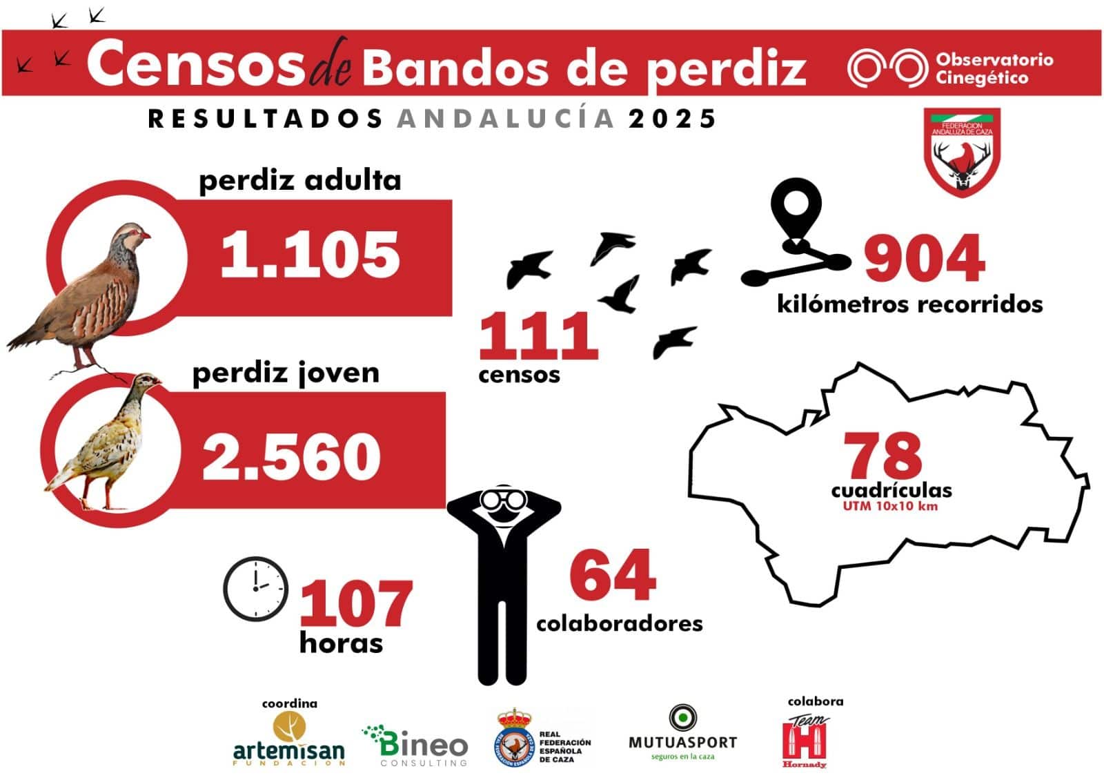 Los andaluces observaron un total de 1.105 perdices adultas y 2.560 jóvenes durante sus recorridos. Estos datos, recopilados en tiempo real mediante la aplicación CensData, son fundamentales para evaluar el estado de las poblaciones y el éxito reproductor de las perdices este año.