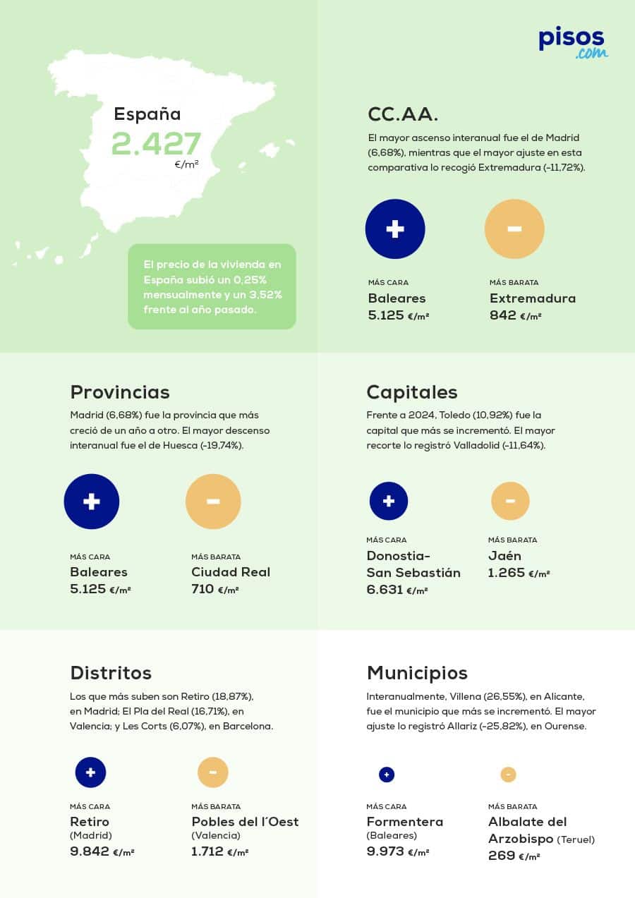 En el ámbito municipal, las localidades de Villena, Arnedo y Trujillo resaltan por los aumentos en los precios, contrastando con Allariz, Moguer y Toro, que experimentan las caídas más drásticas. Formentera se alza como el municipio con el precio por metro cuadrado más elevado, superando los de Madrid y Barcelona, mientras que Albalate del Arzobispo en Teruel resulta ser la localidad más asequible de todo el país.