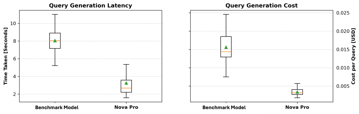 Amazon ha implementado un sistema de evaluación para analizar la calidad de las consultas y sus resultados, logrando una precisión del 74.17% tras pruebas con 120 preguntas. Los resultados también muestran que Amazon Nova Pro supera a modelos de referencia en latencia y costo, ofreciendo consultas más rápidas y económicas por token.