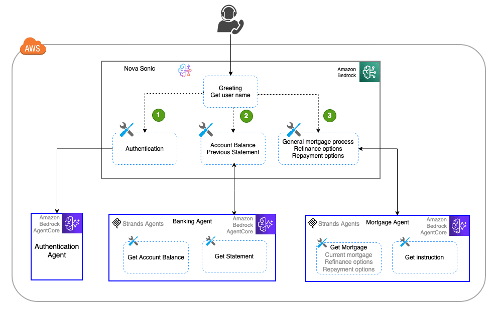 El punto fuerte de Nova Sonic es su arquitectura multicliente, que se distingue por ser modular, robusta y escalable. Estos atributos la hacen idónea para aplicaciones de voz de alto rendimiento. Los agentes de voz integran el marco de sub-agentes de Strands y utilizan Amazon Bedrock AgentCore, creando un sistema efectivo para gestionar múltiples clientes simultáneamente.