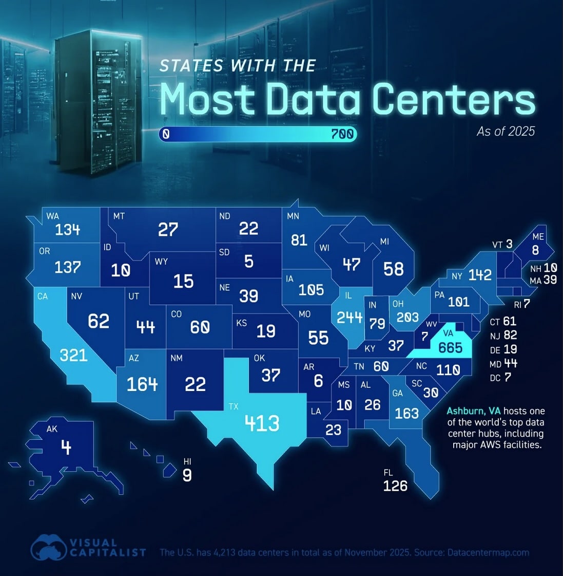 Virginia se alza como el líder indiscutible en esta geografía tecnológica, con 570 centros de datos listados, según los últimos datos de DataCenterMap. Esta preeminencia no es fortuita. El condado de Loudoun, particularmente Ashburn, apodado “Data Center Alley”, ilustra el «efecto red» donde la alta concentración de conectividad y proveedores atrae a más actores del sector, creando un ecosistema difícil de replicar en otras regiones. Sin embargo, este crecimiento también desata debates sobre el impacto ambiental, como el consumo de energía y agua, y la disponibilidad de suelo.