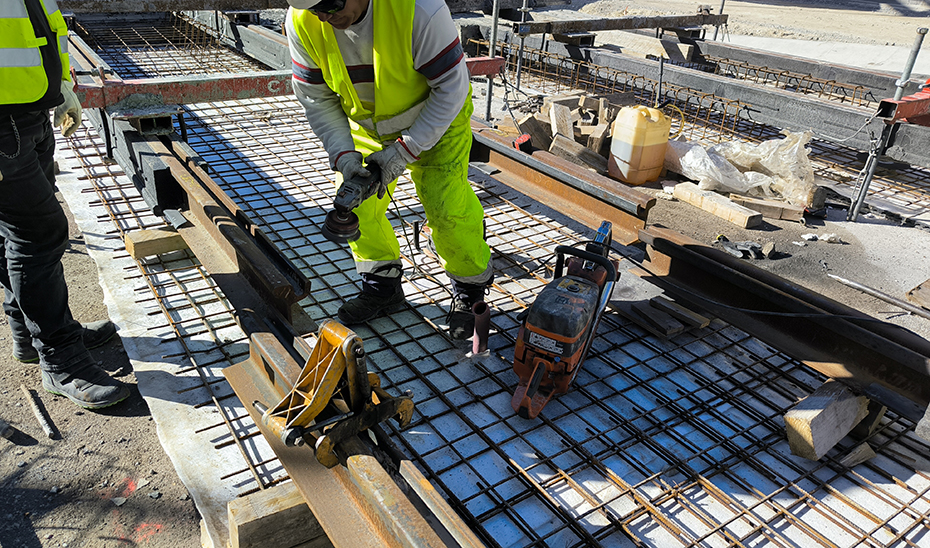 El proceso de soldadura de los carriles, realizado mediante una reacción aluminotérmica, garantiza uniones duraderas y seguras. Posteriormente, se lleva a cabo una comprobación por ultrasonido para asegurar la calidad de las soldaduras.