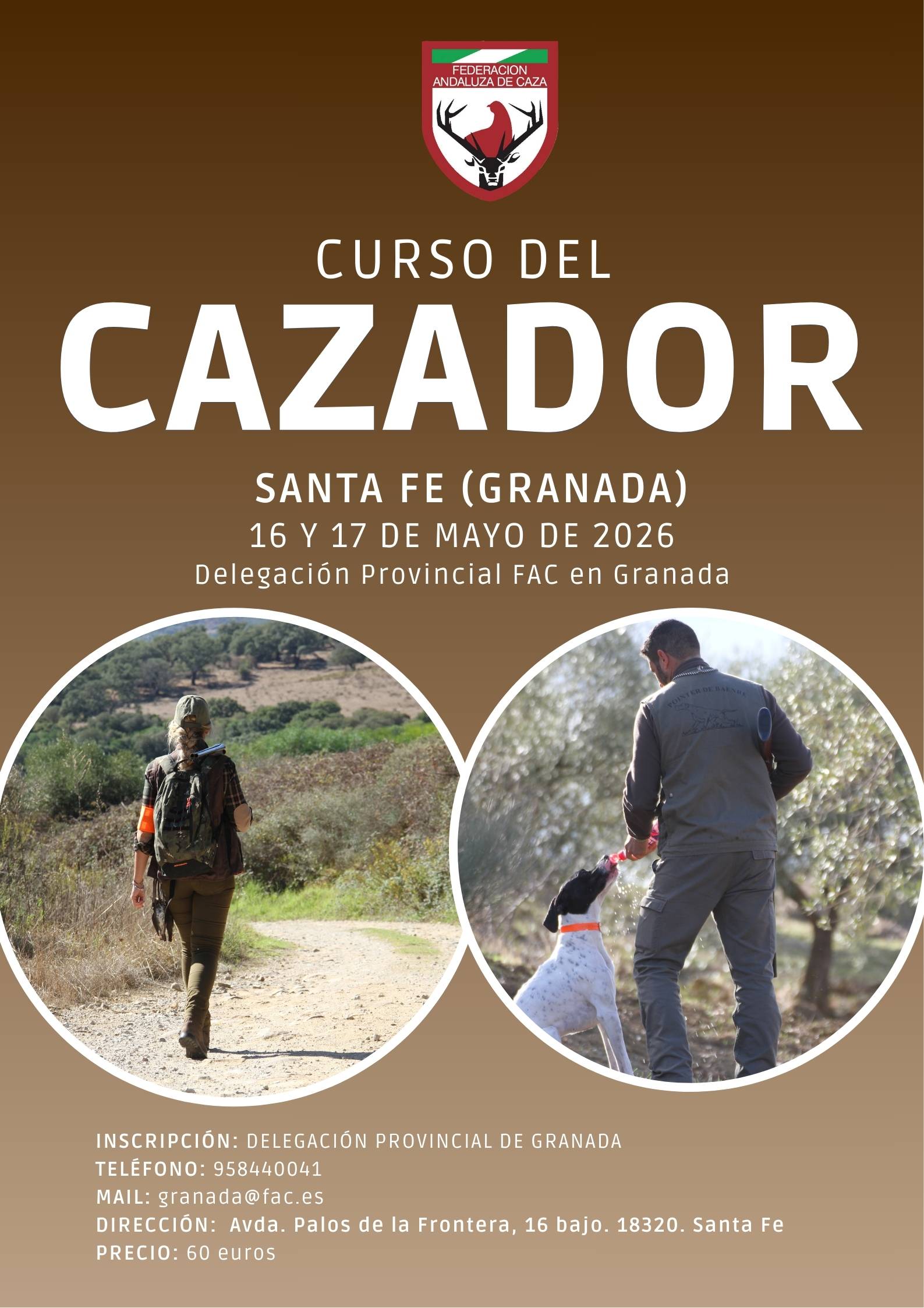 La Federación Andaluza de Caza (FAC) ha anunciado que ya está abierta la convocatoria para inscribirse en el curso presencial de cazador que tendrá lugar en la provincia de Granada durante el mes de mayo. Este curso se celebrará concretamente en la localidad de Santa Fe, los días 16 y 17 de mayo de 2026, y se desarrollará en la Delegación Provincial de la FAC ubicada en Avenida Palos de la Frontera, 16.