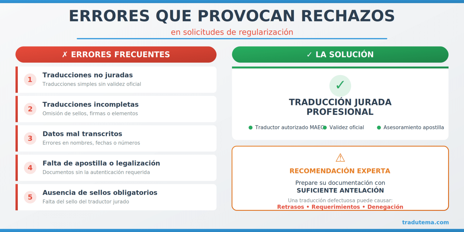Traductores especializados han señalado que traducciones no juradas, incompletas o incorrectamente transcritas, así como la falta de apostilla o legalización consular, son errores comunes que pueden llevar a que una solicitud sea desestimada. Este desafío es particularmente significativo para personas de países donde los documentos oficiales no están en español, como Filipinas, Marruecos, Rumanía o China.