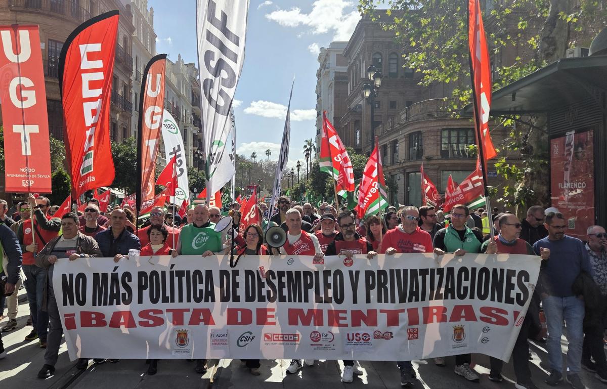 La Sección Sindical de CCOO en el Ayuntamiento de Sevilla ha organizado hoy una movilización enérgica en colaboración con otros sindicatos presentes en el comité de empresa. Esta acción se ha llevado a cabo en coincidencia con la celebración del pleno municipal y ha reunido a numerosos trabajadores y trabajadoras que se han manifestado en defensa de los servicios públicos y en contra de la tendencia privatizadora del gobierno de José Luis Sanz.