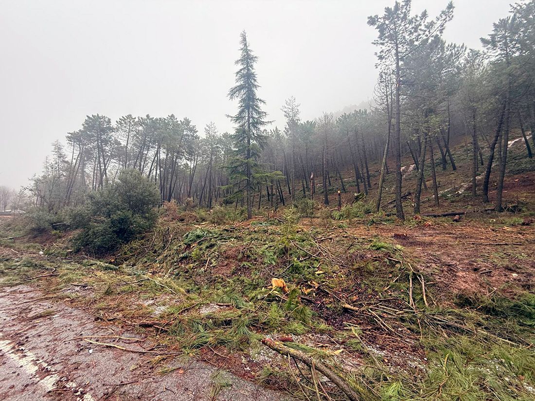Además, debido a las recientes borrascas, las tareas de tala y extracción han dejado a muchos pinos expuestos, lo que ha resultado en su volcamiento por los fuertes vientos, aumentando la vulnerabilidad de la masa forestal.