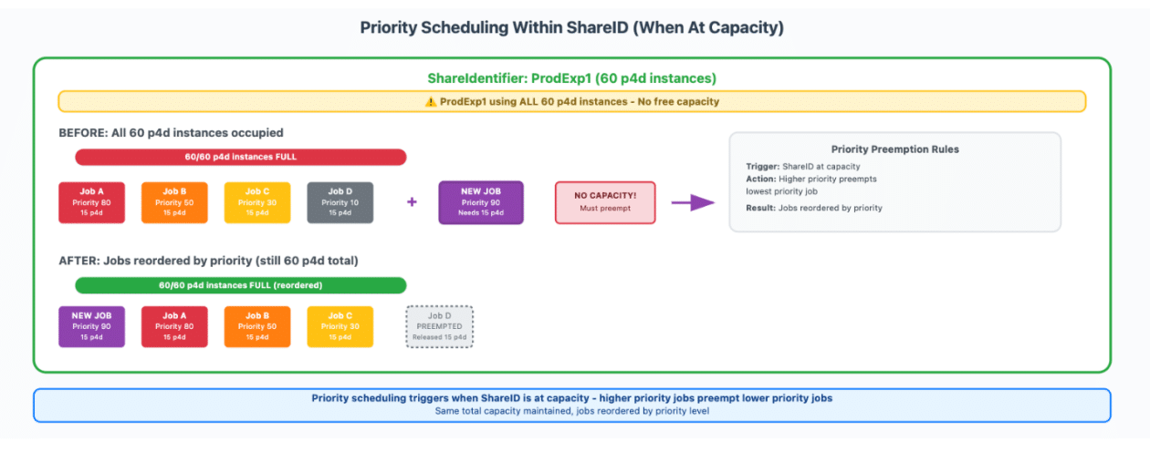 Tras evaluar distintas opciones, Amazon optó por AWS Batch para los trabajos de entrenamiento de SageMaker. Esta integración permite gestionar los trabajos según criterios de prioridad y ha mejorado la utilización de instancias de GPU de un 40% a más del 80%. Parte de la implementación consistió en crear entornos de servicio que definieran la capacidad total de GPU y asignaran identificadores de uso para manejar y priorizar las cargas de trabajo.